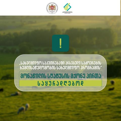 საქართველოს მთავრობის 2021 წლის 6 ოქტომბრის N497 დადგენილებით განსაზღვრული „სახელმწიფო საკუთრებაში არსებული საძოვრების ხემლისაწვდომობის სახელმწიფო პროგრამის“ ფარგლებში მონაწილის სტატუსის მქონე პირთა საყურადღებოდ!